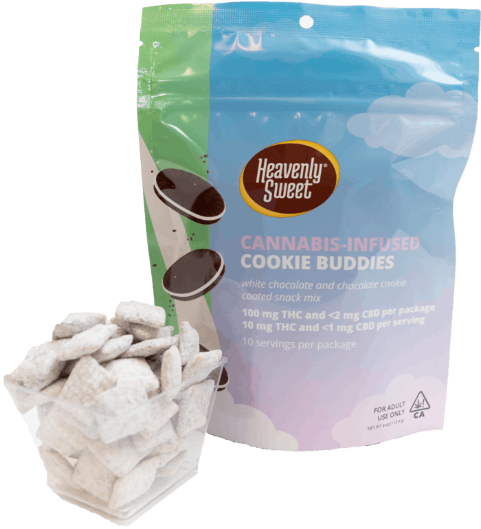 The latest addition to our “buddies” line, this cookie-liscious Munch is an incredible mixture of corn cereal coated with white chocolate and cream-filled-chocolate-sandwich-cookie bits topped with powdered sugar and more cookie bits! Try them right out of the bag or frozen! This delicious munch contains 100mg of THC (10 standard doses) per package
