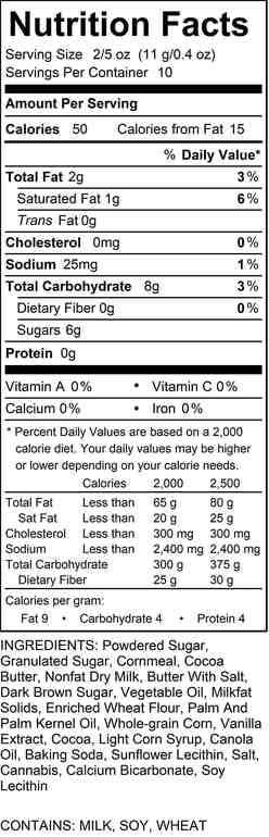 The latest addition to our “buddies” line, this cookie-liscious Munch is an incredible mixture of corn cereal coated with white chocolate and cream-filled-chocolate-sandwich-cookie bits topped with powdered sugar and more cookie bits! Try them right out of the bag or frozen! This delicious munch contains 100mg of THC (10 standard doses) per package
