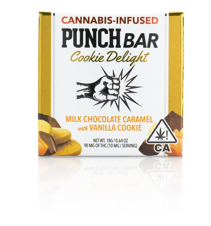 The PunchBar just got even better! Creamy milk chocolate with caramel flavor on top and a perfect vanilla cookie on the bottom. 90mg THC.