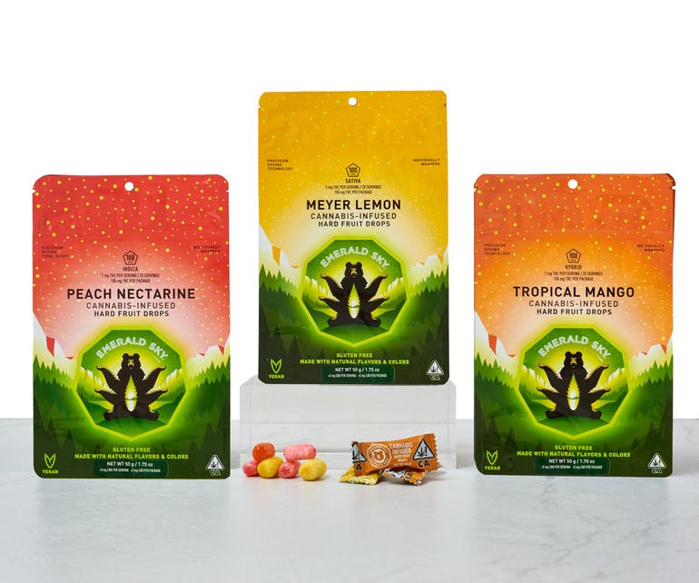 Emerald Sky Meyer Lemon Hard Fruit Drops are delicious, artisanally crafted hard candies, brightly flavored with the natural essence of Meyer lemons. Each 5 mg candy is accurately dosed with THC Sativa to provide a daytime high. All 20 candies in the bag are individually wrapped, making them super easy to take on the go. What a delightful way to start your day! 5mg THC per serving, 20 servings and 100mg THC total. Ingredients: Sugar, Corn Syrup, Citric Acid, Natural Meyer Lemon flavor, Gum Arabic, Turmeric, Cannabis Extract. (License No. CDPH-10002851)