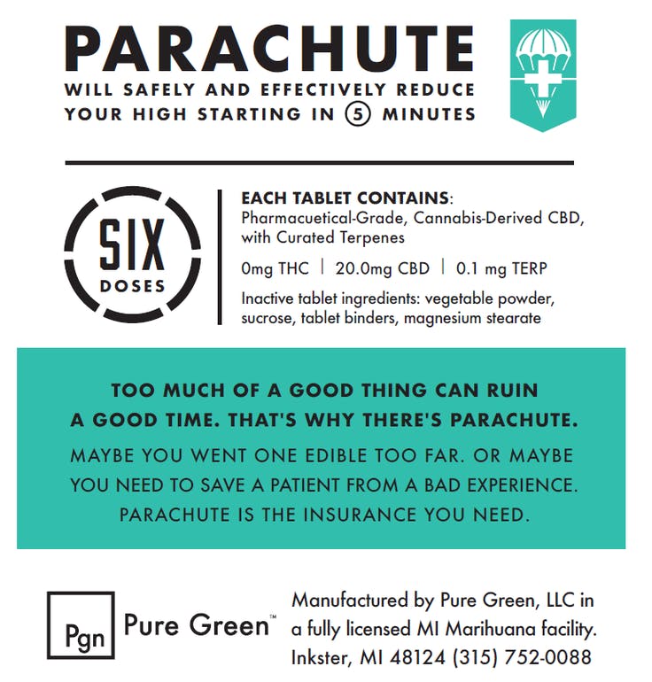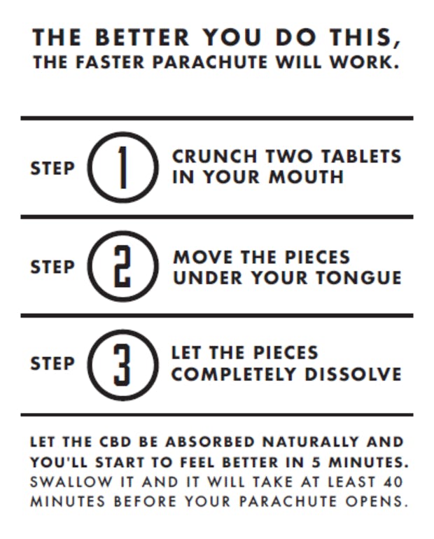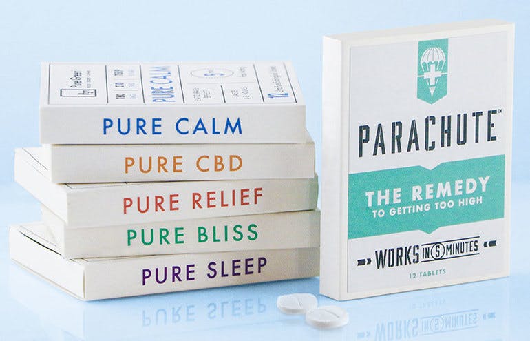 If you or a friend were to get too high, Parachute will safely and effectively reduce your high starting in just FIVE MINUTES. Minty, melt under-the tongue tablets are easy to use and they’ll stay fresh in your kit for up to two years.